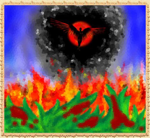 Пламя вырывается наружу, испепеляя тёмно-зелёное полотно и траву вокруг, тела терзающихся в агонии зверей, настигает бегущих охотников и их жертв. Всё зелёное море, ставшее всего мгновение назад колыбелью, за мгновение превращается в выжженную пустыню, над центром которой парит фигура, полускрытая всполохами огня и едким чёрным дымом.