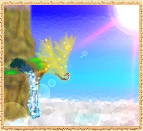 Это была женщина со снежно-белой кожей и прозрачными крыльями из золотистых перьев, одетая в лёгкую накидку из тёмно-зелёной ткани. Светлые волосы, сияющие белым золотом, сбегали на плечи, словно охваченные негасимым пламенем, а в глазах переливались живым светом изумруд и топаз, рубин и сапфир. Величественно улыбнувшись девочке, она прошла мимо и вспорхнула на костёр, который тут же вспыхнул высоко вверх радужным сиянием, после чего осыпался и рухнул, сменив пламя на разноцветный дым.
