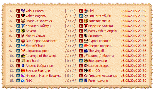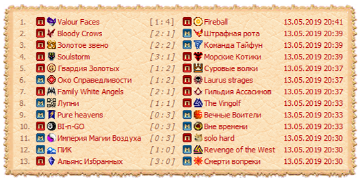 Тур, датированный 13 мая, оказался несколько специфическим. Не все кланы отошли от праздничных возлияний, что обусловило низкую явку. И это в общем-то читалось. Но что случилось со жребием... Возможно, он также засиделся без дела и в понедельник решил покуражиться. Возможно, причина в другом - один из кланов золота, Elite of Chaos, не вышел отстаивать свою высокую позицию, тем самым сбив с ритма весь квартал. Точнее, матчинг. В итоге сразу три представителя золота сразились с кланами Серебряной лиги. А с учетом прорвавшихся в золото Лаурусов - четыре. И получилось, надо сказать, интригующе. Присмотритесь к скриншоту. Когда в золоте уже решили все вопросы, набрав заветные три балла, во многих других парах, рангом пониже, было на что посмотреть, за кого поболеть и о чем подумать.