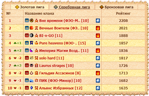 Смерти вопреки лидируют в серебре, но в золоте пока нет кланов с показателем 1520 баллов и ниже, поэтому рано говорить о переходах между лигами.