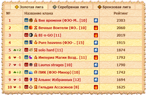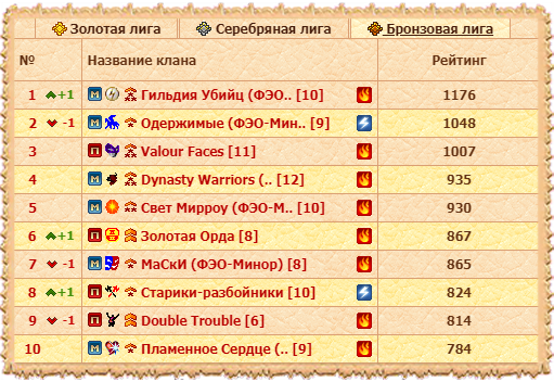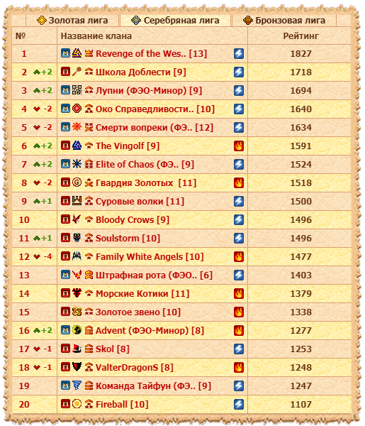 Сперва Гильдия Убийц проиграла клану Skol. А затем ГУ одолела Valour Faces. Угадайте, кто лидирует в бронзе? Правильно, Гильдия Убийц. Кстати, переходы между лигами здесь тоже не состоялись. У 20-го клана в серебре значительно больше 1020 баллов. Поэтому миноровские Убийцы останутся в бронзе до конца сезона.