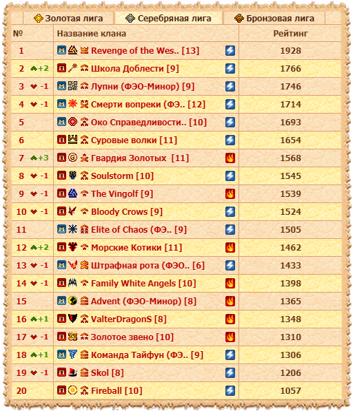 Сразу шесть бойцов в этой паре вышли за показатель 30 тысяч урона и выше. Причем по этой статистике у кланов равенство - по три героя. Но в целом Школа смотрелась солидней и победу получила закономерно. Как и серебряные медали в Серебряной лиге. Главные конкуренты Школы Доблести - миноровские Лупни - последний тур своим участием обделили. И довольствуются третьим местом.