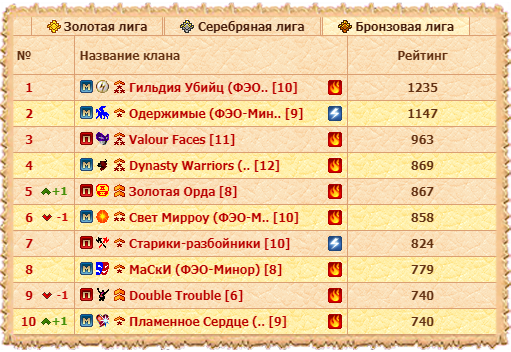 В Бронзовой лиге снова наблюдалась лишь одна пара. Гильдия Убийц за 44 минуты сломила сопротивление Valour Faces и с огромным отрывом победила в лиге. Сформировав при этом тотальный триумф представителей Минора. Кланы этого сервера - первые во всех трех лигах. Причем с неоспоримым очковым запасом.