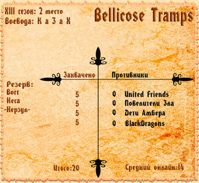 Последнее сражение Свары без пополнения из Pro et Contra. Уже в понедельник клан волшебным образом преобразится, удвоив явку и многократно увеличив боевую мощь. А противостояние с Underground Legion завершилось молниеносной победой дружины, ведомой Stein. Дольше всего сражались за красный остров, где и наблюдается воевода победителей. А воевода Свары нигде не наблюдается. Либо не смог определиться, выходить на красный или серый (там бой завершился на пару минут раньше), либо просто решил сэкономить обкаст. Так или иначе, представление о самобытном составе Свары первые туры дали. Теперь черед версии 2.0.