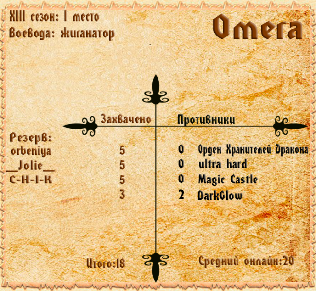 Мегера: Итог битвы примерно следующий: онлайн выдался хуже некуда. В резерве у нас были Рулез, Мег, Нободи, Крымчак и воевода Лимит. Два острова упали практически сразу, потому как даже некого было поставить танковать на них. Вот вообще некого, люди еще утром предупредили, что не успевают. А тут Омега, и мы еще без стягов в придачу. Ну, судьба :) Резерв пришлось распечатывать раньше. Один остров был взят 100% нами, оставалось еще два, один из которых отвоевал наш воевода. На последнем острове дрался уже весь остальной резерв. Жиге пришло благо дракона, что к его и без того сильному персу прибавило той еще непоколебимости :) Плюс много богов на ману, ребята так и не смогли ему ее сбить. В итоге Жиганатору даже не приходилось крутить ЖВ, он спокойно набивал стаки воли. Бадя упал, так как мана закончилась, нимфеи не жаловали. А без маны и хп постепенно упало. Минут 10 спустя и Рулез упал, вроде у него интернет отрубило. Но все равно, чтобы снести Жигу в том бою - не знаю, на скольких богов пришлось бы уповать Руле, потому как перс Жиги с учетом стаков и дракона был сильнее.