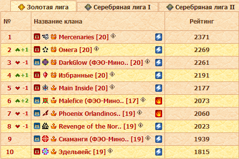 Избранные (4-е место в прошлом сезоне) - стабильны. В первом туре повоевали с кланом Spelaean brothers менее получаса. Явка - 45 бойцов. Процентов на 98 - те же лица, что и в прошлом сезоне. Следовательно, итоговая позиция клана скорее зависит от количества более сильных сборных в золоте. Но более жесткая борьба на вершине означает и больше потерь очков в сражениях между собой... А это шанс как раз для Ромбов и ряда других участников.