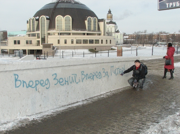 На противоположенной стороне мы увидели и сам завод. Под мостом через речку Упа мы полюбовались плавающими уточками и с радостью понаблюдали за двумя парами. Одной парой были голуби, где самец, гордо распушив перья на груди, вытанцовывал вокруг своей избранницы, которой, как казалось со стороны, и дела нет до ухажера. А второй парой были утки, они держались вместе и не отходили друг от друга дальше, чем на полметра. Уже перейдя мост, Зига начал довольно хихикать, указывая на стенку барьера. А на ней синим цветом красовалась надпись: «Вперёд Зенит, Вперёд За Питер», возле которой грех было бы не сфотографироваться.